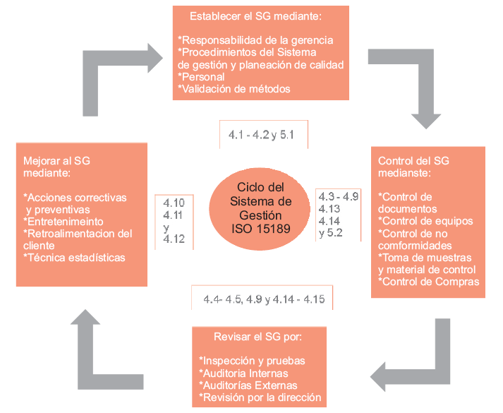Así mismo, después de realizar el proceso de evaluación y acreditación correspondiente, en noviembre del 2005 y en febrero del 2006, dos laboratorios clínicos del país recibieron la primera acreditación bajo la Norma ISO 15189:2003 de la ema y de UKAS respectivamente. En la figura 1, se resume el ciclo del sistema de gestión de la ISO 15189.