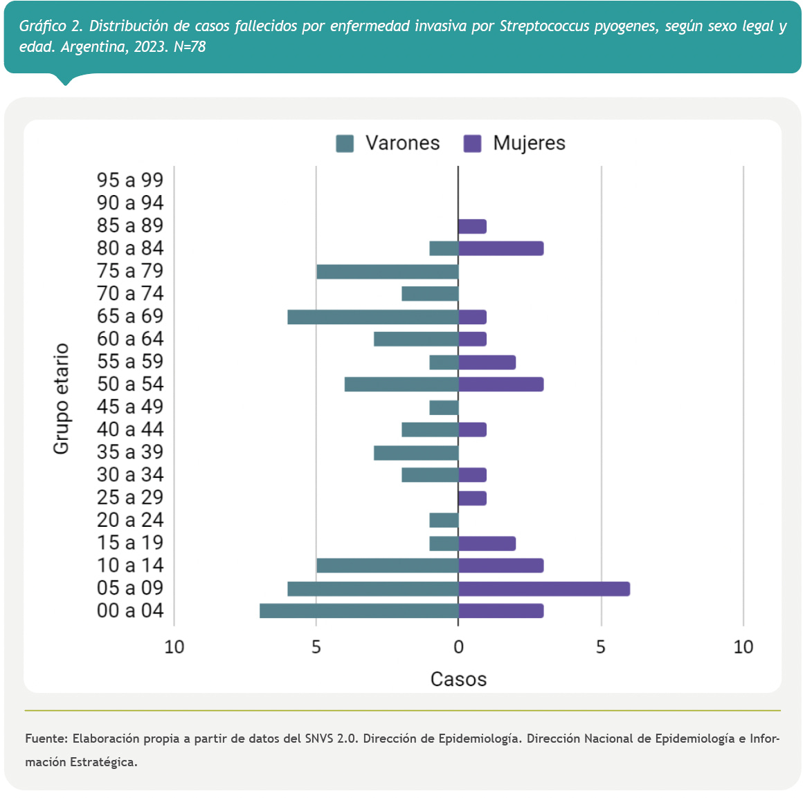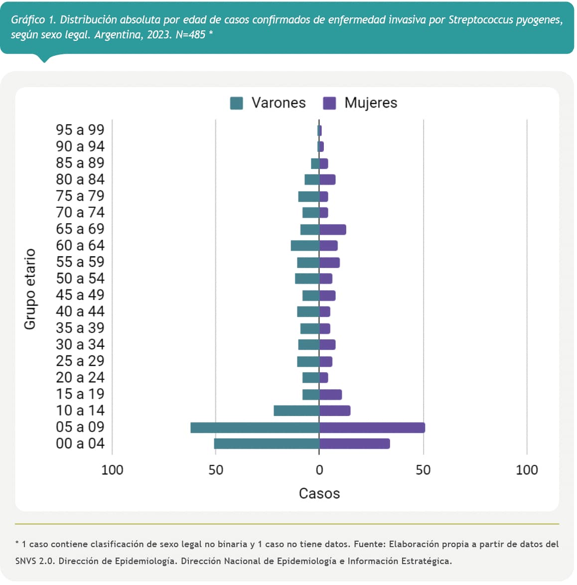 Desde el 1° de enero y hasta el 6 de noviembre de 2023, se notificaron al Sistema Nacional de Vigilancia de la Salud (SNVS 2.0) 487 casos de infección invasiva por Streptococcus pyogenes (SGA) en todo el país, de los cuales 78 se trató de casos fallecidos.