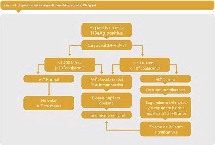 En pacientes con antígeno e positivo, se considera que si tienen carga viral sobre 2.000 UI/mL y ALT elevada deberán recibir tratamiento. Pacientes con carga viral mayor a 2000 y ALT normal, es probable que se encuentren en fase inmunotolerante, por lo que se debe observar y controlar (Figura 1 ver a la derecha).