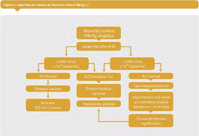 El manejo en pacientes con antígeno e negativo (Figura 2 ver a la derecha), si la carga viral es mayor a 2000 UI/mL y con ALT elevada, se debe indicar tratamiento; si la ALT es normal, se deberá hacer seguimiento en forma regular cada 3- 6 meses. Si la carga viral es muy baja, con ALT normal, probablemente se trata de un paciente portador inactivo quien no debe recibir tratamiento y debe ser controlado cada 6 a 12 meses.