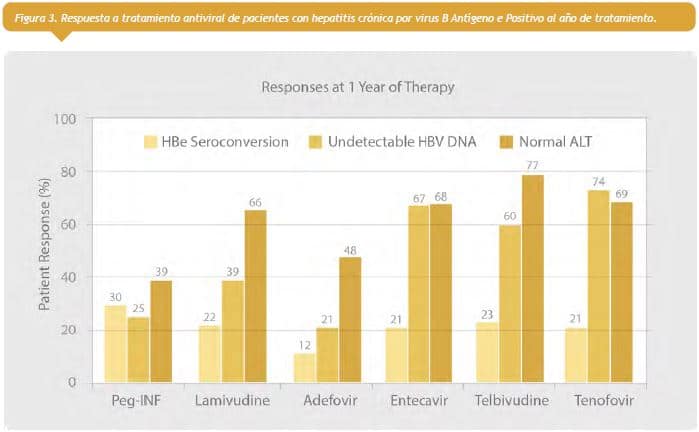 Dientstag y cols. mostraron las comparaciones de la respuesta al año de tratamiento en hepatitis B crónica HBeAg (+) (Figura 3 ver a la derecha). Con peginterferón hubo 30% de seroconversión de HBeAg y 39% de normalización de transaminasas al año; con entecavir hubo 21% de seroconversión de HBeAg y 67% de normalización de transaminasas (4, 5).