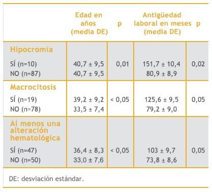 Se encontraron diferencias significativas al comparar la presencia de hipocromía, macrocitosis o, al menos, una alteración hematológica (de las cinco evaluadas) en relación con la edad y la antigüedad laboral (Tabla 1). Los casos positivos tuvieron, en promedio, mayor edad y antigüedad laboral que los casos negativos. El valor promedio de VCM fue el único que particularmente presentó diferencia significativa entre trabajadores con antigüedad mayor o igual a 55 meses (91,6 ± 6,6 fL) frente a los que tuvieron menos antigüedad (88,65 ± 7,2 fL).