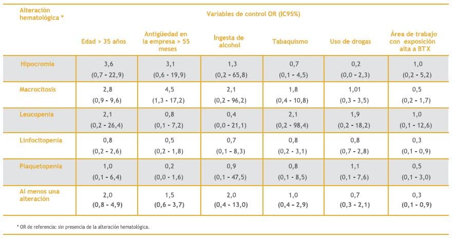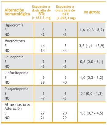 Asimismo, se efectuó un análisis crudo para evaluar la asociación entre las alteraciones hematológicas (macrocitosis, hipocromía, leucopenia, linfocitopenia, y trombocitopenia) o la presencia de, al menos, una de ellas, con la dosis potencial acumulada de exposición a la mezcla de BTX alta (>652,3 mg de BTX/kg/jornada/ años laborados) y baja (≤ 652,3 mg de BTX/kg/jornada/ años laborados), con cálculo de la razón de odds (OR) e intervalos de confianza al 95% (IC95%).