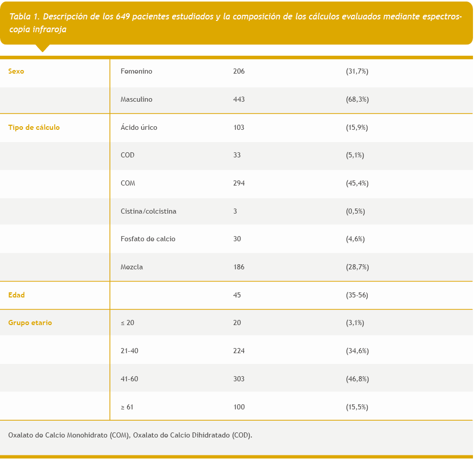 Análisis de la composición química de litiasis urinaria de 649 pacientes mediante espectroscopía infrarroja, primera experiencia nacional
