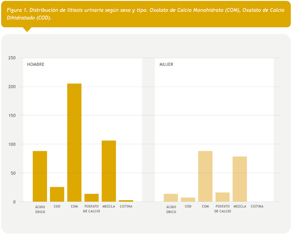 A modo de conclusión, este estudio, primero en su tipo a nivel nacional y con la serie más grande de pacientes documentada hasta la fecha, demuestra que el principal componente de litiasis es el oxalato de calcio monohidrato, siendo el grupo predominante hombres adultos.