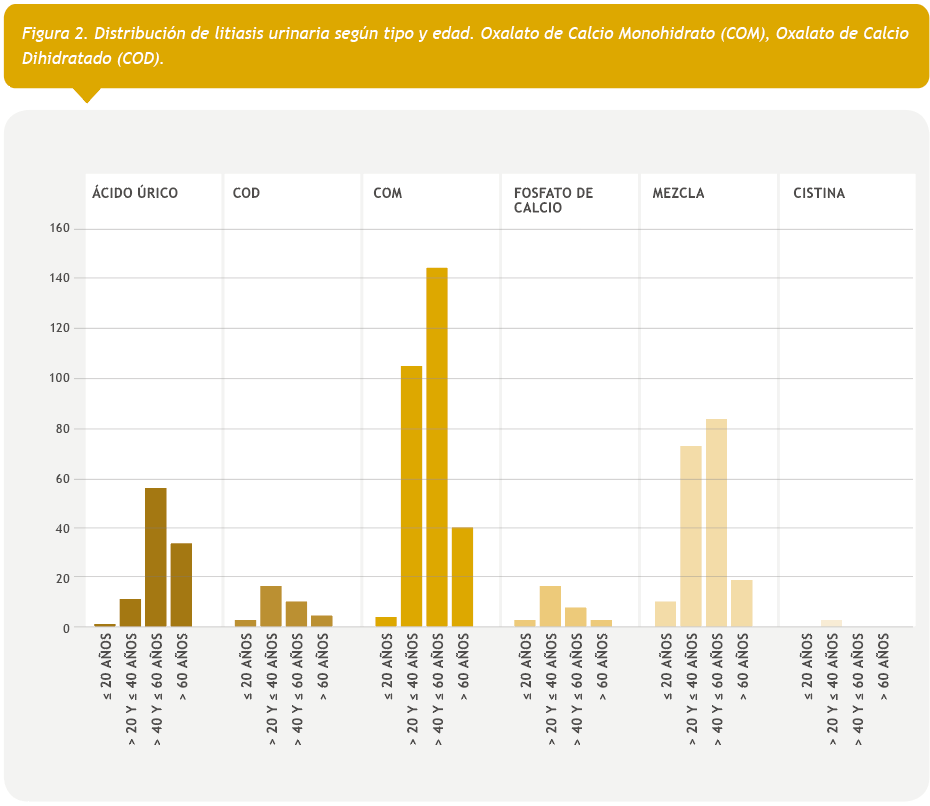 Un análisis de 4.399 litiasis mostró que el principal componente de los cálculos urinarios correspondía en primer lugar al COM (presente en 93% de las litiasis), seguido de COD (en 57%) y ácido úrico en 12% de los cálculos11. Este estudio concluye que la composición de ácido úrico aumenta proporcionalmente respecto al grupo etario analizado, hallazgo ya descrito por Leske13?y Usman14; y la incidencia de COD disminuye con el paso de los añosy la de COM se mantiene relativamente alta en todos los grupos de edades, hallazgos semejantes a la distribución de COM