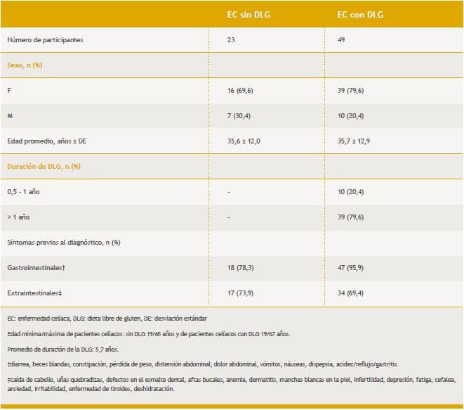 En el presente estudio se incluyeron 72 pacientes adultos con EC activa (sin DLG) o tratados (con DLG). Las características demográficas y clínicas de los pacientes celíacos se detallan en la Tabla 1. Todos los pacientes incluidos en el estudio presentaron niveles de IgA total dentro del rango normal.