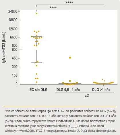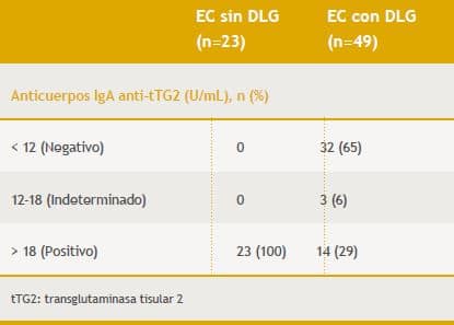 El 100% (23/23) de los pacientes celíacos sin DLG presentó niveles séricos positivos de anticuerpos IgA anti-tTG2 y el 35% (17/49) de los pacientes celíacos con DLG (promedio de duración de la dieta de 5,7 años) presentó niveles positivos e indeterminados, como se muestra en la Tabla 2.