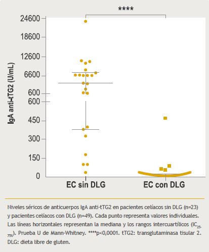Materials and methods: Adult celiac disease patients without (n=23) or with (n=49) GFD were included in this observational, descriptive, cross-sectional study with analytical component. IgA anti-tTG2 antibody serum levels were analyzed by ELISA.