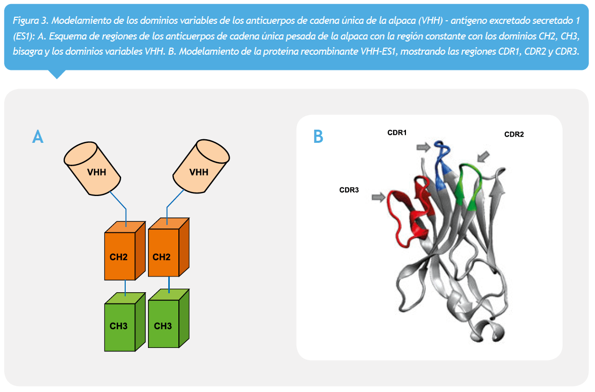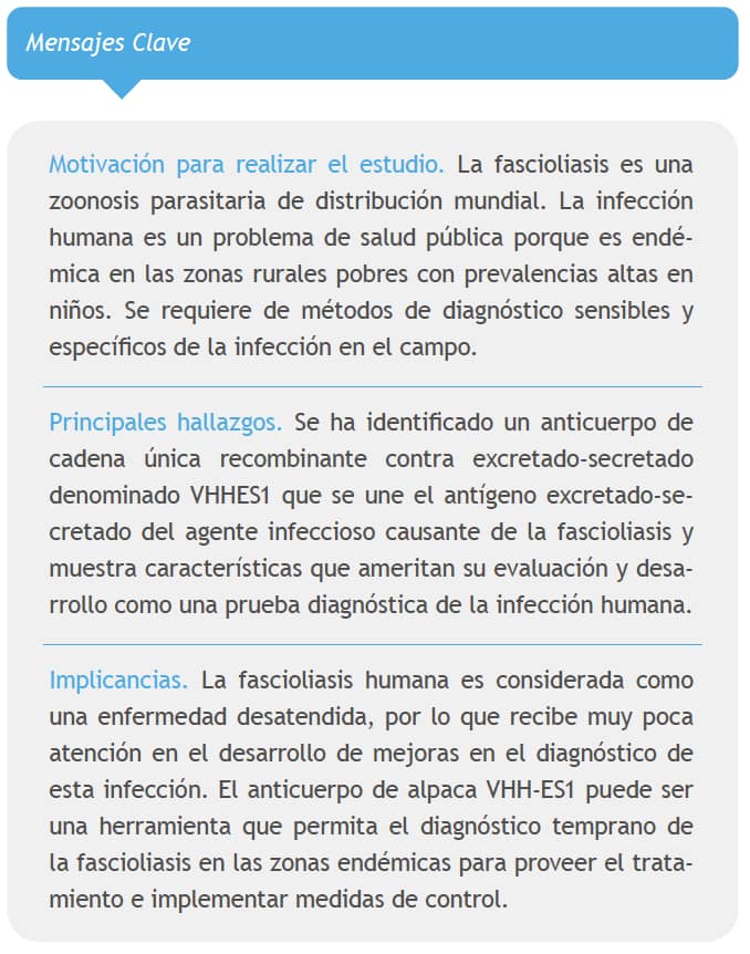 Hasta el momento las moléculas usadas para la detección de antígenos de Fasciola hepatica en diferentes formatos de diagnóstico son los anticuerpos monoclonales de ratón; no obstante, los dominios variables de los anticuerpos de cadena única de la alpaca (VHH) tienen la capacidad de unirse a los antígenos de los patógenos (4,5), y son un recurso biotecnológico promisorio para la generación de nuevas moléculas para el diagnóstico de la fascioliasis (6); ya que pueden ser clonados y expresados en E. coli conservando la capacidad de unirse a los antígenos con alta afinidad, especificidad, estabilidad y rendimiento (6), características ventajosas para el desarrollo de tecnologías de diagnóstico de bajo costo y realizables en el campo.