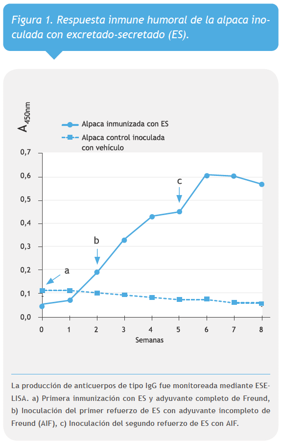 Una alpaca fue inmunizada con 400 μg de ES con adyuvante completo de Freund en la primera inmunización y refuerzos con 500 μg y 700 μg de ES con adyuvante incompleto de Freund (Sigma-Aldrich, USA).