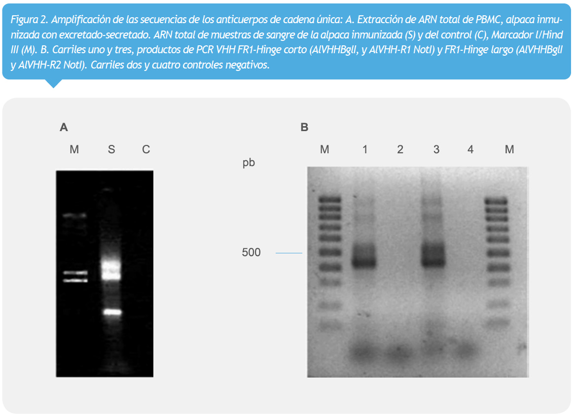 Los niveles de IgG circulantes anti-ES basales fueron de A450 de 0,112 y 0,063 para la alpaca control e inmunizada respectivamente. Niveles recientes de IgG anti-ES se observaron a partir de la segunda semana posinmunización, elevándose A450 0,455 después del segundo refuerzo. En la alpaca control se mantuvieron negativos durante el periodo de inmunización (Figura 1). Después del segundo refuerzo se colectaron 5×107 células blancas, de las que se obtuvo 41 μg de ARN total (ratio A260/280 de 2); el ARN no presentó degradación y mostraba las bandas características ARN total (Figura 2A). A partir del ARN se sintetizó ADN resultando en productos de amplificación de 400 bp característico de los VHH (Figura 2B).