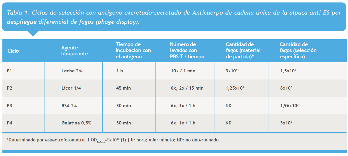 Se inoculó una colonia en 25 mL de 2YT y se incubó a 150 rpm, 37°C hasta A600 0,5. Se agregó 40 μg de ES en inmunotubo (Nunc Maxisorp, ThermoFisher Scientific, SA) e incubó a 4°C por 16 horas. El inmunotubo se lavó seis veces con PBS-T, tres veces con PBS y se bloqueó con 2% leche descremada por 30 minutos a temperatura ambiente. La segunda ronda de selección se usó Odissey-Licor (1/2 en PBS) y la tercera ronda se utilizó BSA 2%, descartando la solución bloqueadora. Se añadió 1 mL de fagos con agitación durante una hora a temperatura ambiente. La segunda selección se incubó 45 minutos y la tercera por 30 minutos. Los fagos se eluyeron con 1 mL de 100 mM trietanolamina por cinco minutos a temperatura ambiente y se añadió 0,5 mL 1M Tris-HCl pH 7,5. Se añadió 10 mL de E. coli TG1 a 37ºC sin agitación y 30 minutos a 150 rpm. Se hicieron diluciones en 100 μL del cultivo, desde 10-1 hasta 10-5 y se sembró en 2YTGA. El resto se centrifugó, se disolvió en 2 mL de medio 2YT, se sembró en una placa 24×24 con 2YTGA e incubó a 37ºC toda la noche. Las bacterias fueron cosechadas y colocadas en 5 mL 2YTA. Se colocó 30 uL en 100 mL de medio 2YTAG para proseguir con el rescate y el resto se criopreservó en DMSO al 8% a -80ºC.