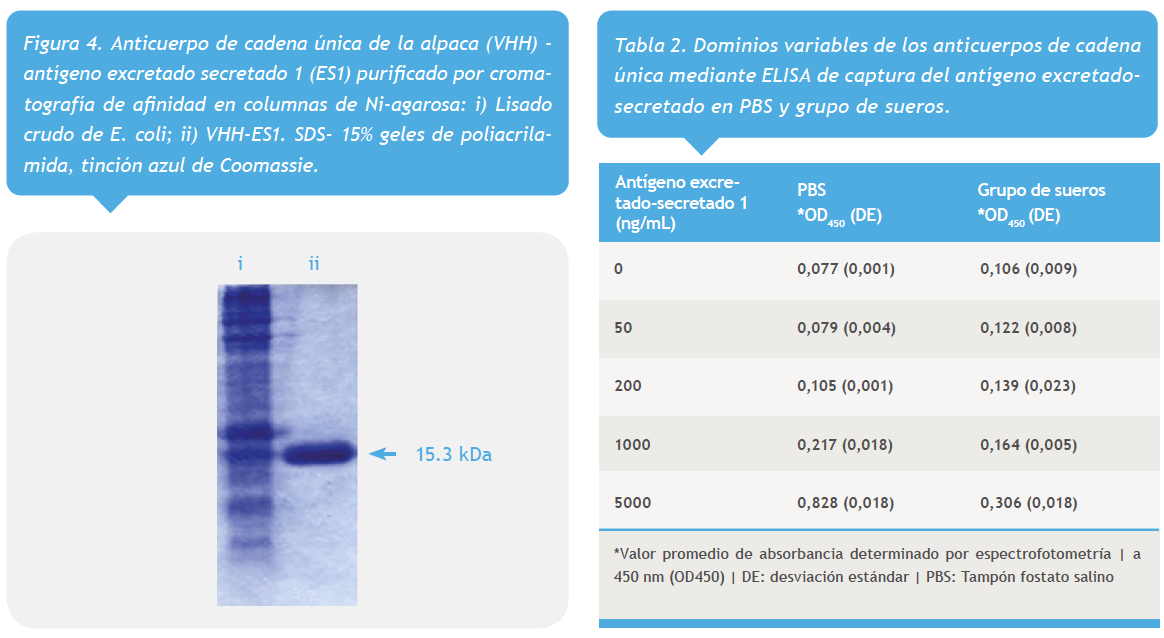 Materiales y métodos. Se ha construido una genoteca de cADNde los dominios variables de anticuerpos de cadena única pesada, conocidos como VHH, a partir de células mononucleares de sangre periférica de una alpaca inmunizada con el antígeno ES de F. hepatica. La genoteca fue tamizada con el antígeno ES por despliegue diferencial de fagos (phage display), seleccionando diez VHH que se unen específicamente a ES. El VHH anti ES fue clonado en un vector de expresión, la proteína recombinante (VHH-ES1) de 15,3 kDa fue producida por fermentación en E. coli y purificada a homogeneidad por cromatografía de afinidad. La unión del VHH-ES1 al antígeno ES fue evaluada por ELISA usando VHHES1 como anticuerpo de captura, antisuero policlonal anti-ES de conejo y conjugado anti IgG de conejo con peroxidasa de rábano.