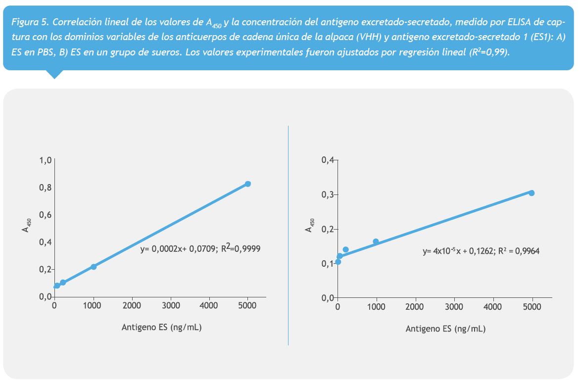 El principal hallazgo del estudio es el anticuerpo VHH-ES1 que se une al antígeno ES con alta afinidad y especificidad. Los resultados del ELISA indirecto muestran que VHH-ES1 se une al antígeno en relación lineal con la concentración de ES. Ensayos de ELISA de captura con VHH-ES1 muestra que los valores de límite de detección están en el rango de 30-170 ng/mL de ES, lo que sugiere su uso potencial en la detección del antígeno en muestras biológicas. El ELISA de captura es el formato idóneo para el desarrollo y validación de tecnologías de detección de