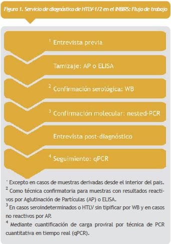 Nuestro instituto realiza desde 1989 el diagnóstico de HTLV-1/2 a partir de muestras derivadas por diferentes profesionales de la salud desde múltiples puntos del país, brindando una atención integral al individuo. Nuestro flujo de trabajo (Figura 1 ver a la derecha) comienza con una entrevista en el Instituto, la cual consiste en la realización de una serie de preguntas (antecedentes personales), así como la firma de un consentimiento informado. Posteriormente, se procede a realizar un diagnóstico serológico para la infección, el cual incluye una AP. Para brindar un resultado final, las muestras reactivas por tamizaje son confirmadas por WB y en aquellos casos en que se obtiene un resultado indeterminado, HTLV sin tipificar por WB o no reactivo, se realiza una nested-PCR.