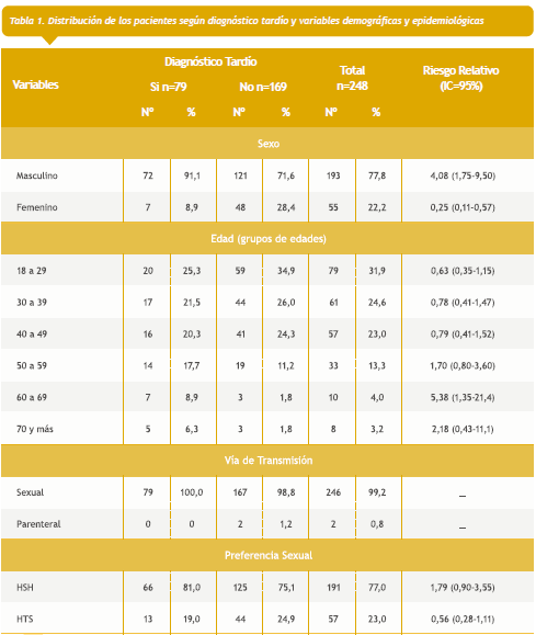 La transmisión sexual fue la vía de contagio en la totalidad de los casos con diagnóstico tardío, mientras que la preferencia sexual predominante fue HSH (77,0 %). No se encontró relación significativa entre estas variables y la presencia o no de diagnóstico tardío.