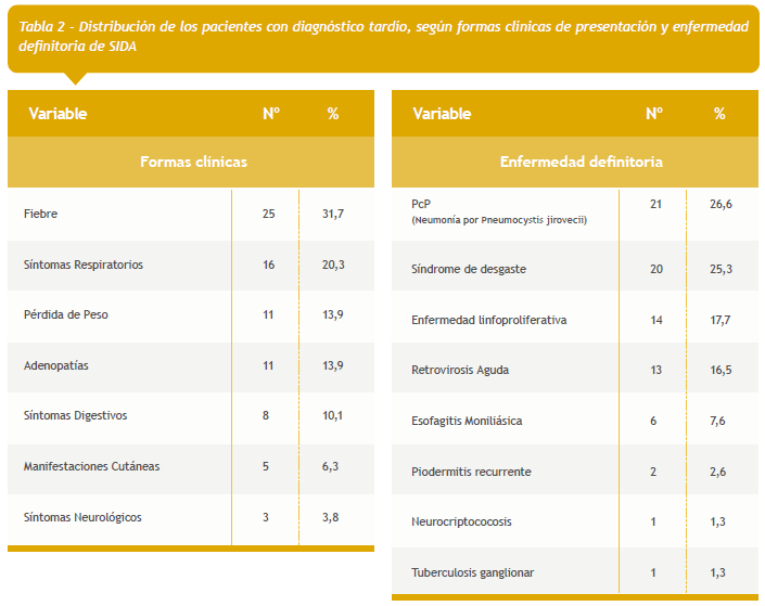 De acuerdo con las formas clínicas de presentación, en los pacientes con diagnóstico tardío de SIDA predominó la fiebre (31,7 %) y los síntomas respiratorios (20,3 %), seguidos por la pérdida de peso y las adenopatías (13,9%), respectivamente. La enfermedad definitoria de SIDA más frecuente fue la neumonía por Pneumocystis jirovecii (PcP), seguido por el síndrome de desgaste y la enfermedad linfoproliferativa. (Tabla 2)