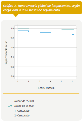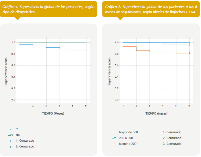 Por otro lado, la mortalidad en el grupo con niveles de linfocitos T CD4+ menor de 200 cél/mL a los 6 meses de seguimiento fue significativamente mayor respecto a aquellos con niveles de 200 a 500 cél/mL y de estos con respecto a los pacientes con más de 500 cél/mL (Tabla 4). Las curvas de supervivencia mostraron una sobrevida global a los 6 meses de seguimiento significativamente menor en el grupo de pacientes con niveles de linfocitos T CD4+ menor de 200 cél/mL. (Gráfico 2).