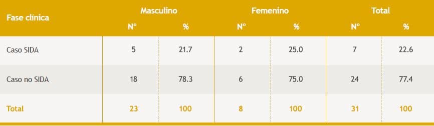 De los pacientes que iniciaron la terapia antirretroviral el 77.4 % les correspondió a los casos no SIDA y un 22.6 % a los casos SIDA (Tabla 1), siendo en proporciones similares en ambos sexos.