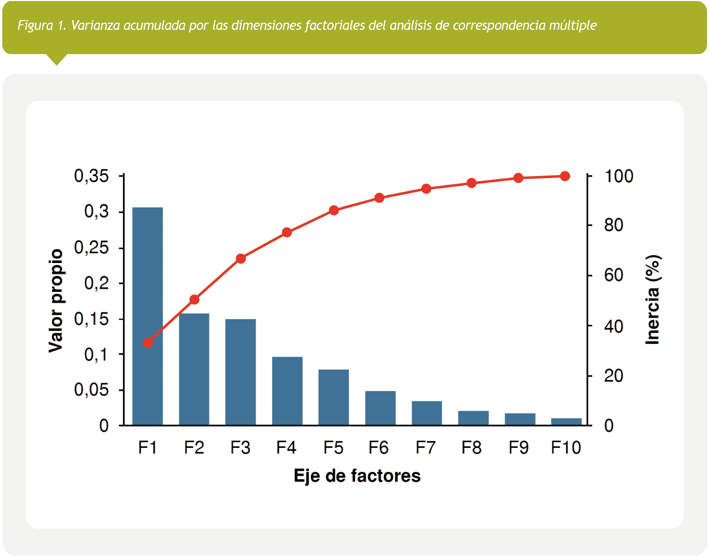 En la figura 1 se muestra el aporte de cada factor a la variabilidad estructural de los datos en el análisis de correspondencia múltiple. Se seleccionaron los factores F1 y F2 para la interpretación, ya que juntos explican el 50,6 % de la varianza asociada con las categorías de los tres componentes del análisis del frotis de flujo vaginal.