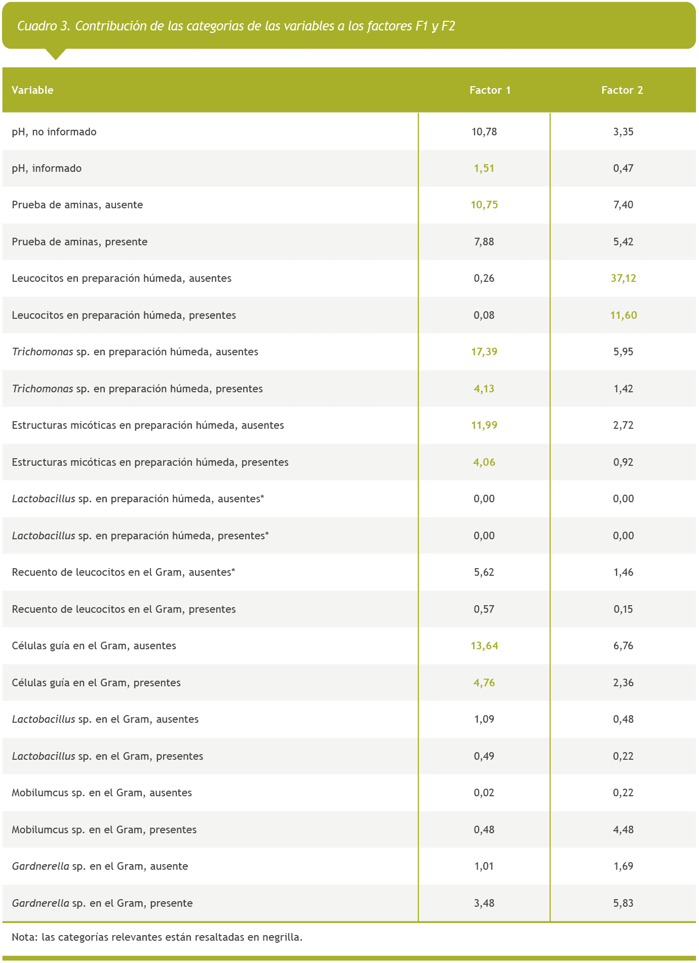 En el cuadro 3 se presenta la distribución de las categorías de las variables de los dos primeros factores (F1 y F2) seleccionados según la figura 1. Se evidencia que todas las categorías relevantes (resaltadas en negrilla) aportan significativamente a estos factores. El factor 1 estuvo influido principalmente por la falta de informe de la prueba de aminas, la ausencia de Trichomonas sp., estructuras micóticas y células guía. El factor 2 agrupó categorías relacionadas con el informe del número de leucocitos por campo a 40X, con una distribución más equilibrada entre categorías.