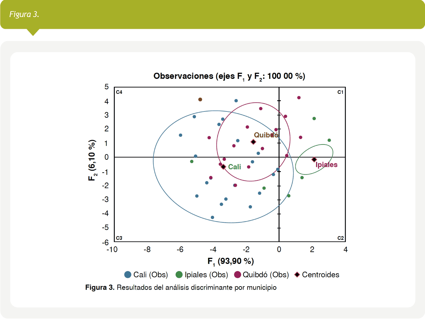 El análisis discriminante confirmó la diferencia entre los informes de Ipiales y los de Cali y Quibdó. Aunque Quibdó y Cali se superponen en el componente húmedo –lo que significa que en este componente los resultados son muy similares, como lo evidencia el índice de calidad del registro y el análisis de correspondencia múltiple (figura 3)–, los laboratorios de Quibdó mostraron un mayor grado de cumplimiento en los componentes químico y de la coloración de Gram, alcanzando resultados similares a los de Ipiales.