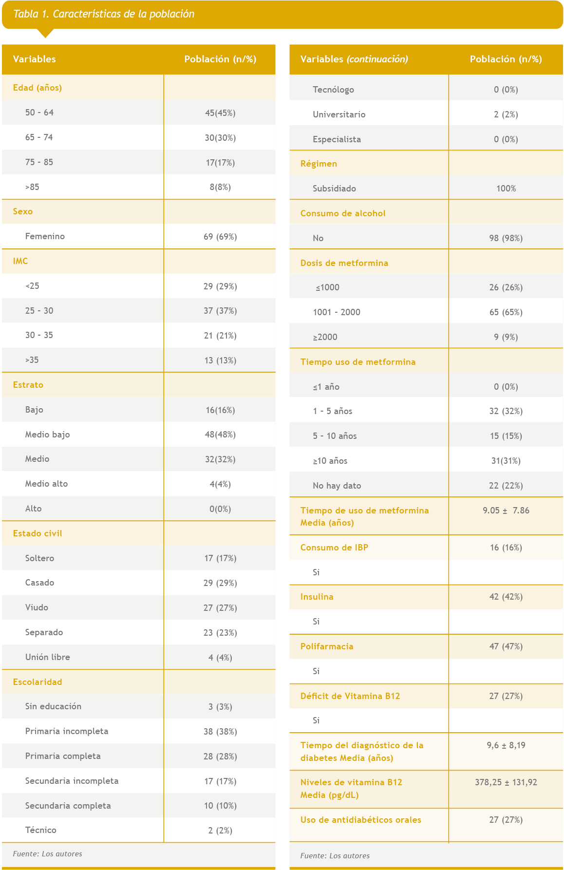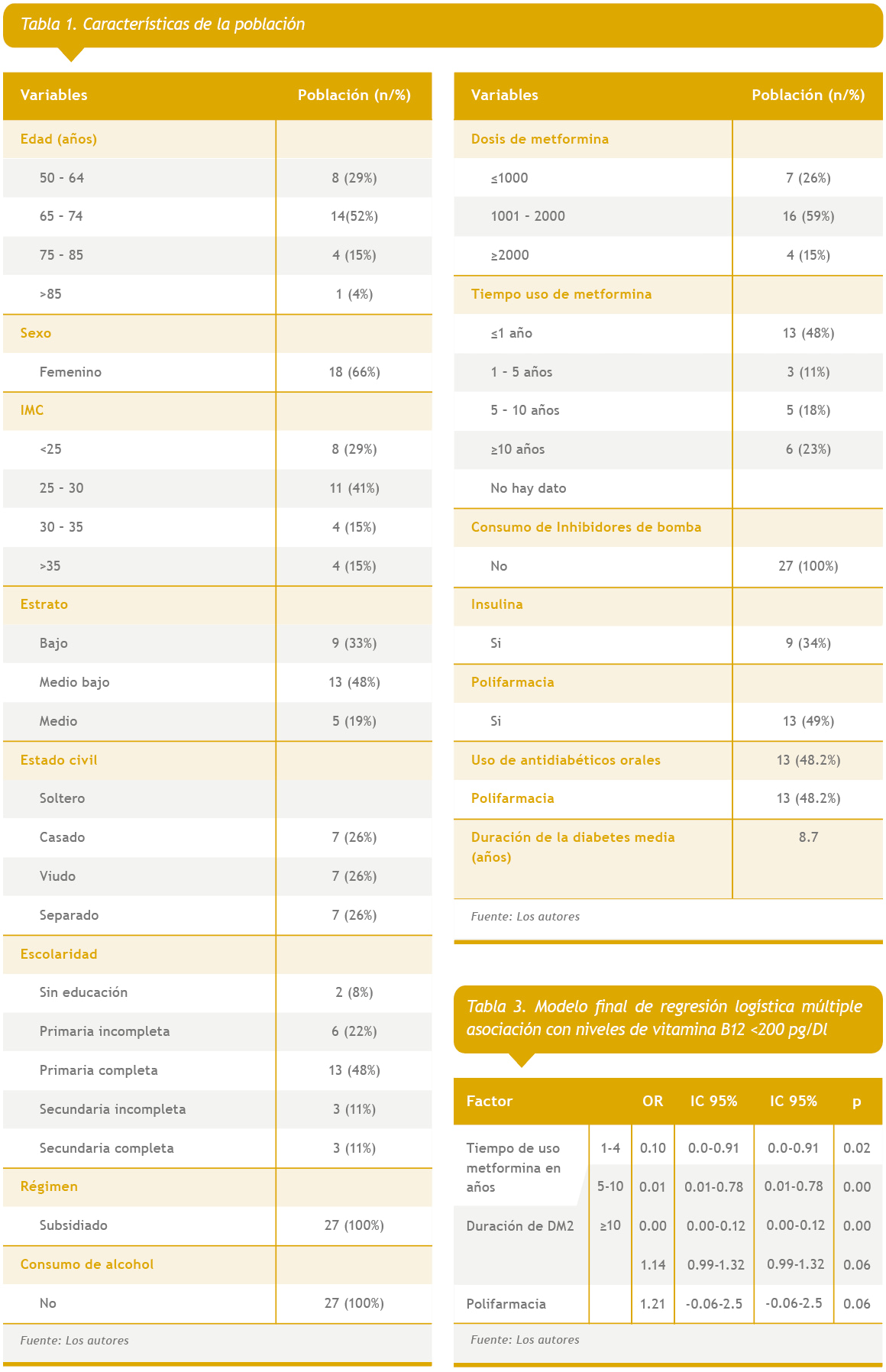 Las variables evaluadas fueron género, edad, talla, peso, índice de masa corporal (IMC), régimen de salud, escolaridad, estado civil, estrato socioeconómico, hábitos alimentarios, suplementos nutricionales, consumo de alcohol, de antiH2, uso de Inhibidores de bomba de protones, consumo, dosis y tiempo de uso de metformina, uso de insulina, polifarmacia y tratamiento indicado frente al déficit de vitamina B12.