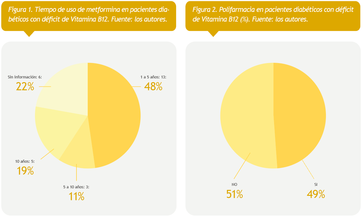 Results: the median duration of the disease was 9.6 years, metformin use ranged between 1 and 5 years (32%), the most commonly used dose ranged between 1001 and 2000 mg (65%), polypharmacy was evidenced in 45% and B12 deficiency prevalence was 27%. The logistic regression analysis showed that time of metformin use behaved as a predictor of vitamin B12 deficiency (OR=0.01 CI95% 0.01-0.03) (p<0.05). Polypharmacy (OR=1.21 CI95% -0.06-2.5) and diabetes duration (OR=1.14 CI95% 0.99-1.32) emerged as predictor factors, but with no statistically significant difference.