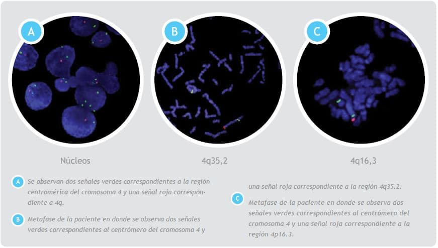 Se aplicó FISH a la paciente para corroborar los resultados obtenidos por citogenética y se emplearon sondas para evaluar el estado de la región 4p16.3 (Chr4: 492870-793359) y 4q35.2 (Chr4: 190183811-190408149) y como control el centrómero del cromosoma 4 (Chr4: 48461959-49066696) según el protocolo de origen (Agilent, Estados Unidos).
