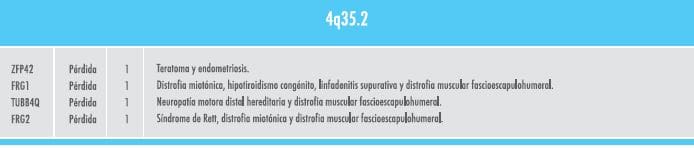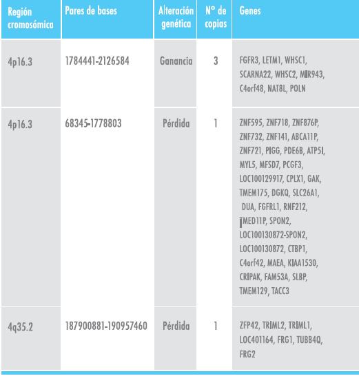 En relación a la FISH, de los 37 casos reportados en la literatura, 13 estudios aplicaron esta técnica [28, 30-32, 34-41, 44]. Estos 13 casos presentaron señales de pérdida a nivel del brazo corto del cromosoma 4 en la región p16.3 y solo cinco casos presentaron señales de pérdida a nivel del brazo largo del cromosoma 4 en la región 4q35 adicionalmente a la pérdida en el brazo corto [31, 34-35, 38-39], como en nuestro caso de estudio. En un solo paciente se reportó la cantidad de material genético que se perdió al formarse el anillo, que fue de 145 kb [35]. El estudio de arrays de mapeo genético realizado en la paciente mostró que en el brazo corto del cromosoma 4, en la región p16.3 se detectó una deleción de 1710,458 Kb y una ganancia de 342,143 Mb; en el brazo largo del cromosoma 4, en la región 4q31.22 se detectó una deleción de 72,099 Mb y en la región 4q35.2 se detectó una deleción de 3056,579 Kb; en ambas regiones cromosómicas del cromosoma 4 en anillo hubo ganancias y pérdidas de varios genes, los cuales provocan diferentes manifestaciones clínicas; tabla 3.