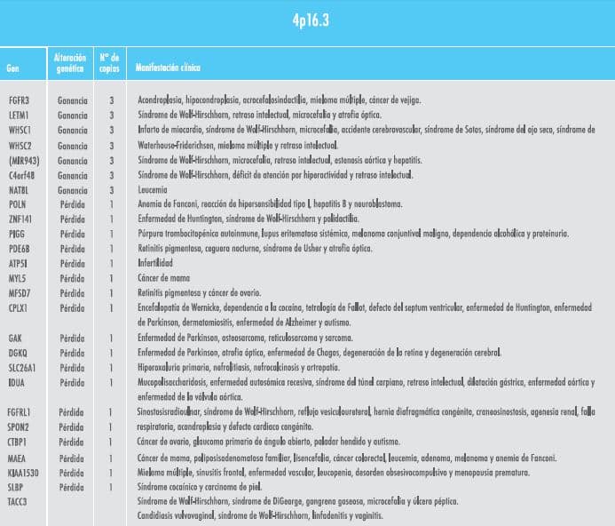 La utilización de los arrays evidenció las regiones de pérdida de los brazos cortos y largos del cromosoma 4 involucrados en la formación del anillo. En el brazo corto del cromosoma 4 en la región p16.3 se obtuvo una ganancia de tres copias de los genes FGFR3, LETM1, WHSC1, WHSC2, MIR943, C4orf48, NAT8L y POLN y pérdida de una copia de los genes ZNF141, PIGG, PDE6B, ATP5I, MYL5, MFSD7, CPLX1, GAK, DGKQ, SLC26A1, IDUA, FGFRL1, SPON2, CTBP1, MAEA, KIAA1530, SLBP, TACC3. En el brazo largo del cromosoma 4 en la región q35.2 se obtuvo pérdida de una copia de los genes ZFP42, TRIML2, TRIML1, LOC401164, FRG1, TUBB4Q y FRG2; tabla 2. Los genes que con seguridad inciden en el fenotipo de la paciente en estudio son LETM1, WHSC1, WHSC2, MIR943, TACC3, IDUA, C4orf48 para retardo mental; LETM1 y WHSC1 para microcefalia y KIAA1530 para retraso en el crecimiento.