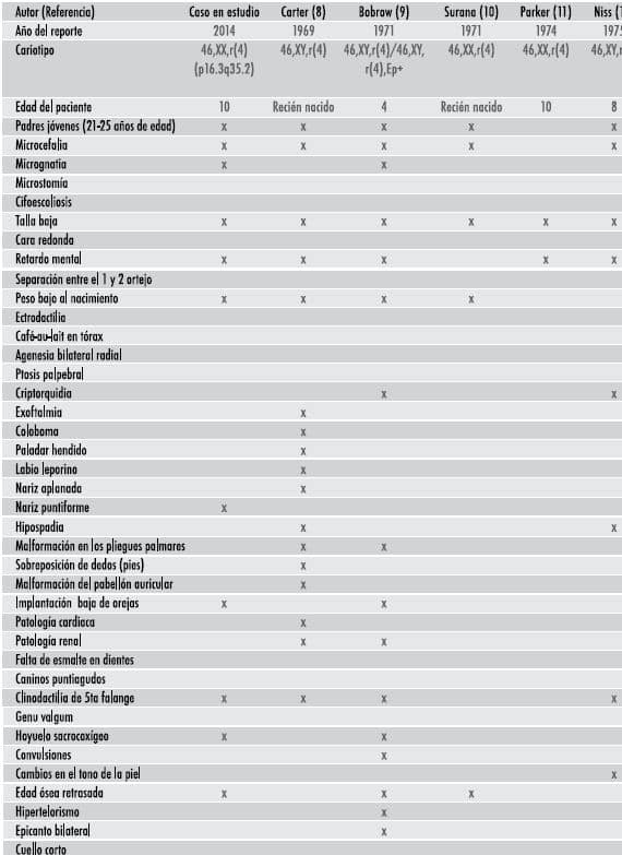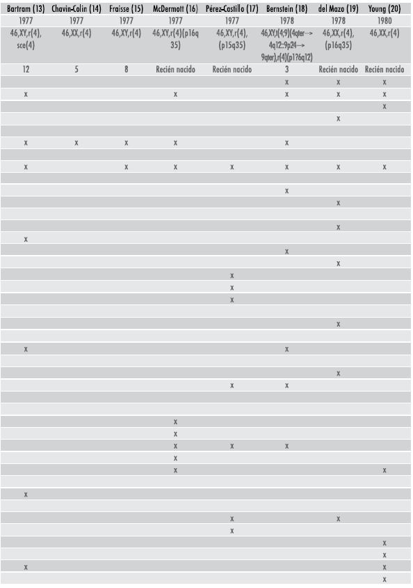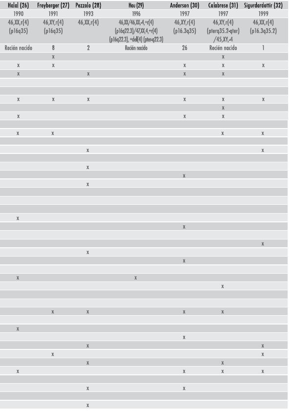 Tabla I. Comparación de las características clínicas de todos los casos reportados con cromosoma 4 en anillo.