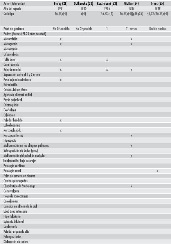 En solo un caso no se encontró mosaicismo, al menos en sangre periférica, y se informó como cariotipo 46XY,r(4)(p16q35) y el anillo fue observado en el 100% de las células [16].