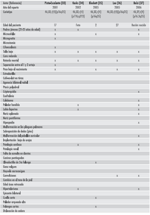 En el análisis clínico de la paciente y los 37 casos internacionales se encontró alrededor de 41 características clínicas diferentes y variables en cada sujeto. Las más frecuentes fueron retraso en el crecimiento (78%), microcefalia (67%), retardo mental (62%), bajo peso al nacer (48%), clinodactilia del quinto dedo (37%), micrognatia (29%), hipertelorismo (21%) y alguna cardiopatía (18%). El estudio citogenético de la paciente a los diez días de edad mostró un cariotipo en mosaico 46,XX/46,XX,r(4) con anillo del cromosoma 4 en el 80% de las metafases. A los diez años de edad se encontró r(4) en el 90% de las células. El análisis por FISH reveló un cariotipo 46,XX,r(4). ishr(4)(p16.3q35.2)(492870-793359-,190183811- 190408149-). Los arrays evidenciaron las regiones de pérdida de los brazos cortos y largos del cromosoma 4 involucrados en la formación del anillo. Los genes que con seguridad inciden en el fenotipo de la paciente en estudio son LETM1, WHSC1, WHSC2, MIR943, TACC3, IDUA, C4orf48 para retardo mental; LETM1 y WHSC1 para microcefalia y KIAA1530 para retraso en el crecimiento.