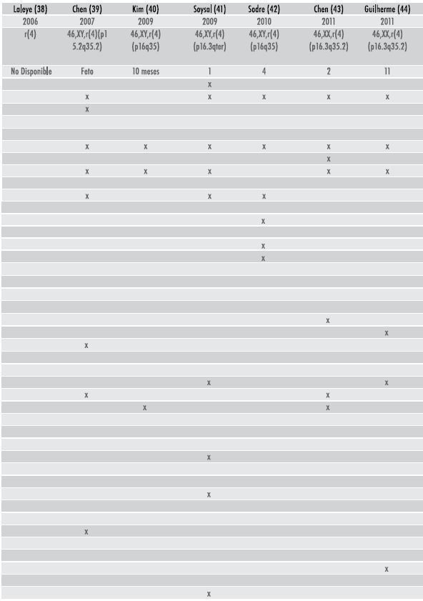 Tabla I. Comparación de las características clínicas de todos los casos reportados con cromosoma 4 en anillo – Continuación