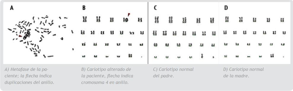 Los resultados del cariotipo convencional de la paciente a los diez días de edad revelaron 46,XX,r(4) (p16q35)/46,XX con un anillo del cromosoma 4 en mosaicismo con 20% de células normales y fórmula sexual 46,XX. La otra línea celular con 46,XX,r(4) en el 80% de las células. A los diez años se encontró 10% de las células normales y r(4) en el 90% de las células. Los resultados de los análisis citogenéticos en los padres fueron normales 46,XX y 46,XY; foto 2.
