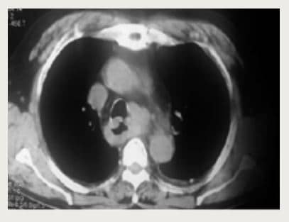 Se le solicitó una tomografía espiral multicorte (TEM) de cuello donde se observó la presencia de imágenes con densidad de partes blandas que conforman masas ganglionares en las cadenas yugulares internas a predominio izquierdo, las cuales miden entre 3 y 6 cm de diámetro y otras masas ganglionares en las cadenas mediastinales de carácter metastásico; engrosamiento significativo de la pared del segmento torácico inferior del esófago hasta 30 mm de espesor, de carácter estenosante, de aspecto neoformativo con compromiso ganglionar. Dilatación del esófago encima de este nivel e incidentalmente efusión pleural derecha. No se apreciaron otras lesiones significativas en tórax, abdomen o pelvis.