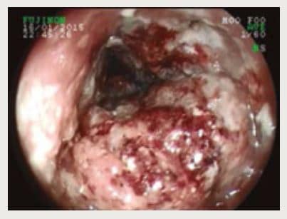 Figura 2. Extensa lesión proliferativa, de color violáceo por sectores, con gran friabilidad al roce, abundante cantidad de fibrina y zonas de necrosis.