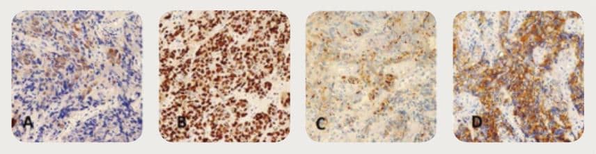 Figura 4. Inmunohistoquímica. A: PanCK positivo focal. B: Ki67 positivo. C: EMA positivo. D: CD56 positivo.