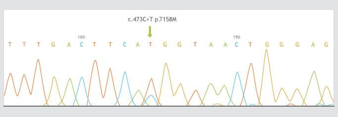 Figura 1. Electroferograma que muestra la presencia de heterocigosis de la mutación c.473C>T p.Thr158Met en el exón 4 del gen