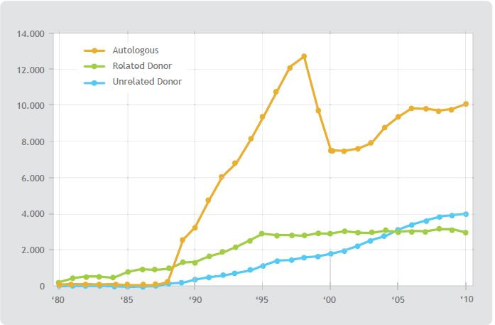 Figura 1 (primer imagen a la derecha). Actividad de transplantes en USA entre los años 1980 – 2010. Comparación entre transplantes autólogos, alogénicos con donantes relacionados, y alogénicos con donantes no relacionados. (www.cibentr.org)