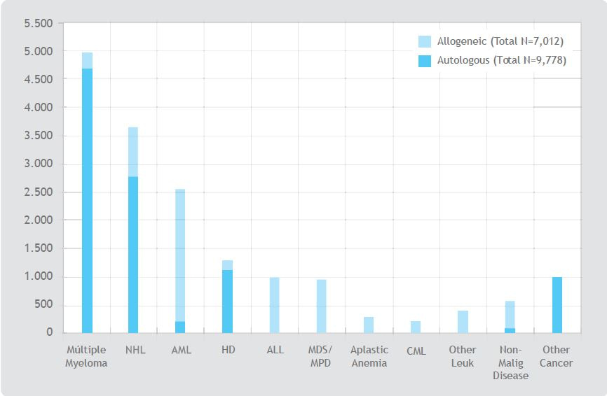 Como se puede observar en la figura.2 el tipo de trasplante varía según la enfermedad del paciente, los trasplantes autólogos se utilizan para leucemias (aguda mieloblástica o linfoblástica), aplasia medular adquirida, tumores sólidos (retinoblastoma, neuroblastoma…), enfermedades producidas por tóxicos, irradiación, virus… a su vez los trasplantes alogénicos se utilizan para tratar leucemias (aguda, crónica y síndrome mielodisplásico), linfomas (Hodgkin y no Hodgkin) y enfermedades hematopoyéticas (anemias, inmunodeficiencias, enfermedad hereditaria metabólica…).