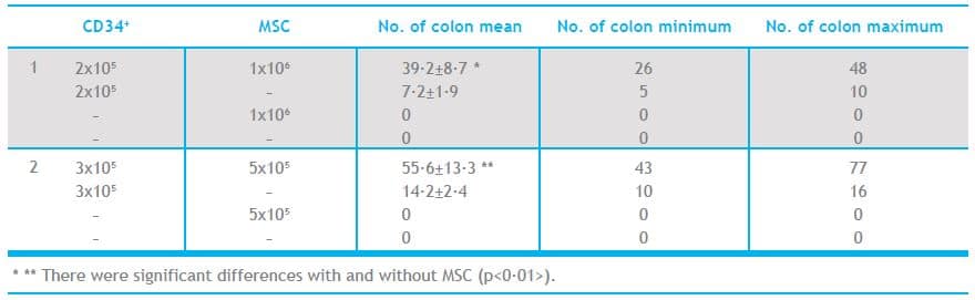 Otro posible uso que se está investigando es el cotrasplante de SCU con MSC. En la tabla 1 observamos como la cantidad de unidades formadoras de colonias aumenta si se cotrasplantan de CD34+ y MSC, con respecto a un trasplante de CD34+ únicamente. Estos datos nos indican que las MSC podrían facilitar el prendimiento de los PH, aumentando la velocidad del injerto.