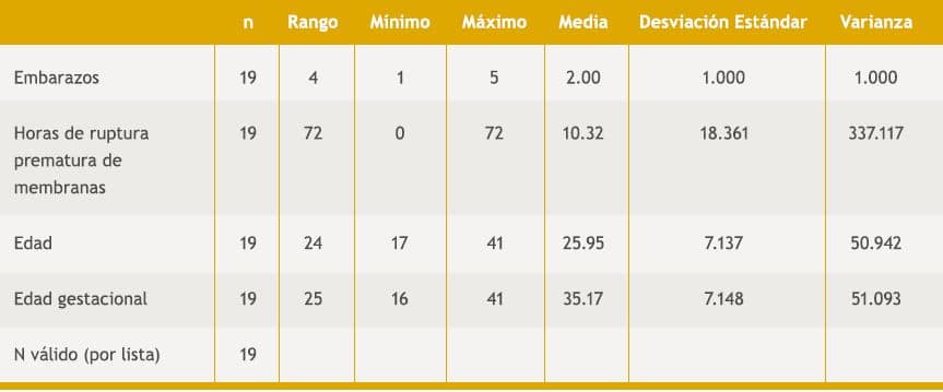 Se efectuaron 20 pruebas con AmniSure® de las que se descartó una toma por deficiencia en la técnica. El total de la muestra fue de 19 pacientes; las medias fueron: edad 25.9 años, embarazos 2, edad gestacional 35.1 y del tiempo de ruptura 10 horas. Cuadro 1
