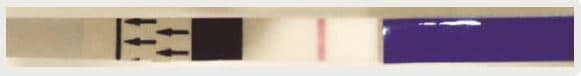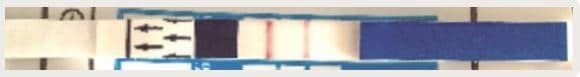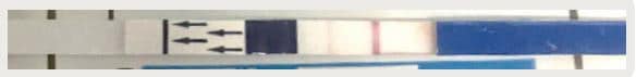 Se enumeran tres ejemplos de la medición de α-microglobulina-1 placentaria. En la Figura 3 se advierte la positividad de la prueba, con dos líneas (una de control y otra que reporta positividad). La Figura 4 muestra que las líneas se colorean de un color tenue y se cataloga positiva y en la Figura 5 solo se colorea la línea de control de la prueba, por eso se cataloga negativa.