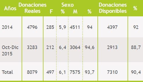 La tabla 1 muestra las donaciones voluntarias realizadas por sexo fueron 8079 en ambos años, de ellas disponibles 7310 para el 90,4%, después de ser rechazadas por resultados positivos a los marcadores infecciosos, sin embargo, en el 2014 fue mayor el por ciento de donaciones disponibles, siendo el sexo masculino el que aporta mayor número de donaciones en el período estudiado.