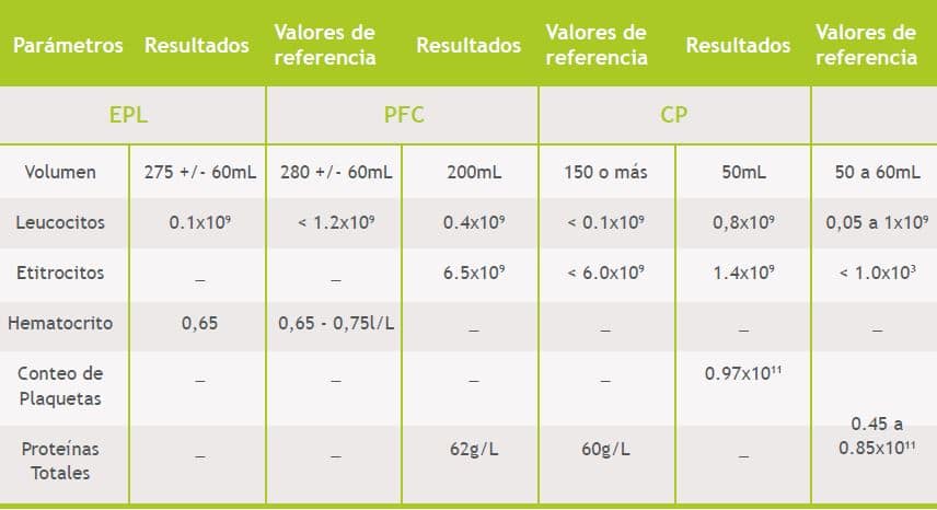 Los resultados de los exámenes de laboratorio y/o pruebas de monitoreo que se utilizan en el control de calidad, según regulación 1-99 del centro nacional para el control estatal de medicamentos, equipos y dispositivos médicos (CECMED). Especificaciones de calidad para la sangre humana obtenida por donación y los Procederes de Banco de Sangre y Servicios de Transfusiones en Cuba como: conteo de leucocitos, eritrocitos, plaquetas, proteínas totales y determinación de hematocrito en los diferentes componentes obtenidos según correspondan, excepto la determinación de FVIII al PFC por no constar con reactivos para la su dosificación, los EPL analizados, el valor del hematocrito estuvo dentro de rango normal, no siendo así el conteo de eritrocitos y leucocitos al PFC y CP, se constatan variaciones discretas en sus resultados, este trabajo es parte de una investigación que se realiza por primera vez sin antecedentes en la institución, teniendo como guía las regulaciones existentes y ninguna experiencia anterior. Con resultado por encima de los valores de referencia está el conteo de plaquetas en el CP y las proteínas totales en el PFC.