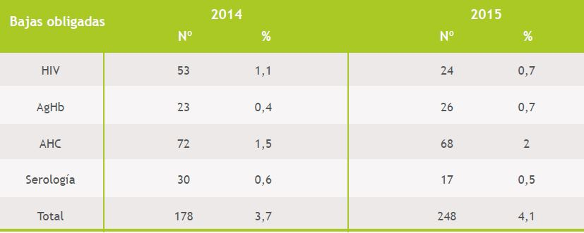 En la investigación, la causa fundamental de bajas obligadas del proceso de producción fue por AHC positivo, seguido por HBsAg positivo fue la causa más frecuente en donantes de sangre.14