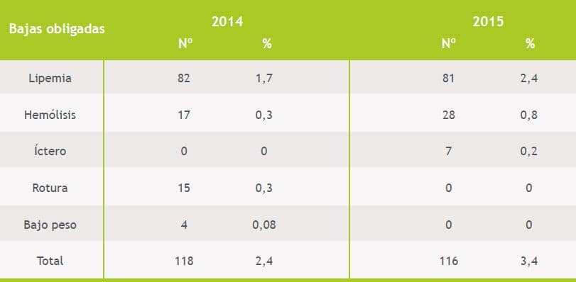 La tabla muestra las bajas no obligadas en el proceso de producción, resultando la lipemia fue la causa fundamental en este caso con 81 donaciones rechazadas en el 2015 para 2,4%, comportamiento similar al año 2014, disminución de un solo caso seguido de la hemólisis con 28 donaciones para un 0,8 % de las eliminadas.